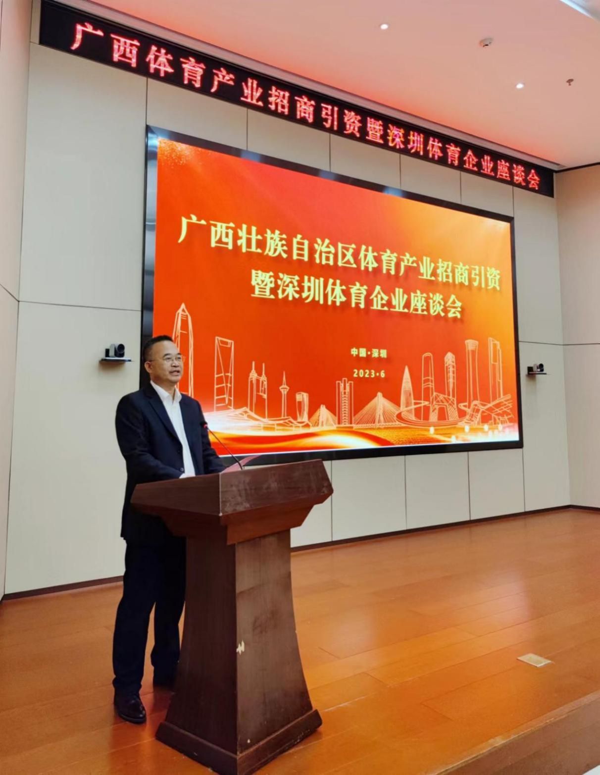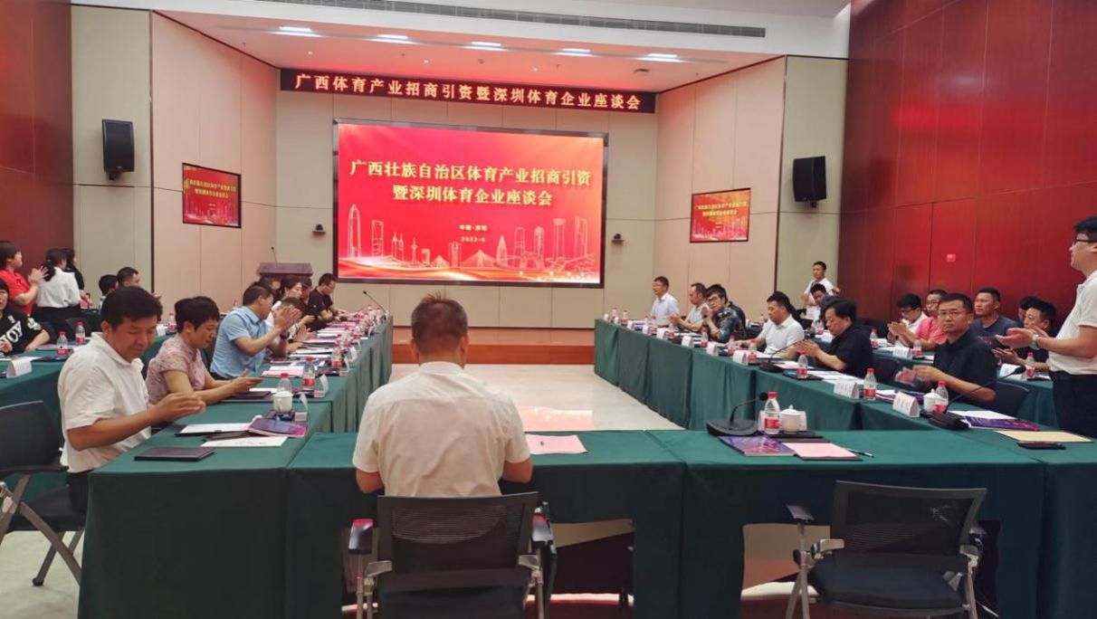 6月7日,广西壮族自治区体育局在深圳举行2023年广西体育产业招商引资暨深圳体育企业座谈会,自治区体育局副局长甘永辉、深圳市文化广电旅游体育局一级调研员(市管)王志强、深圳市体育产业协会、深圳市朝向集团有限公司、喜德盛自行车公司等24家来自深圳的体育企业参会。